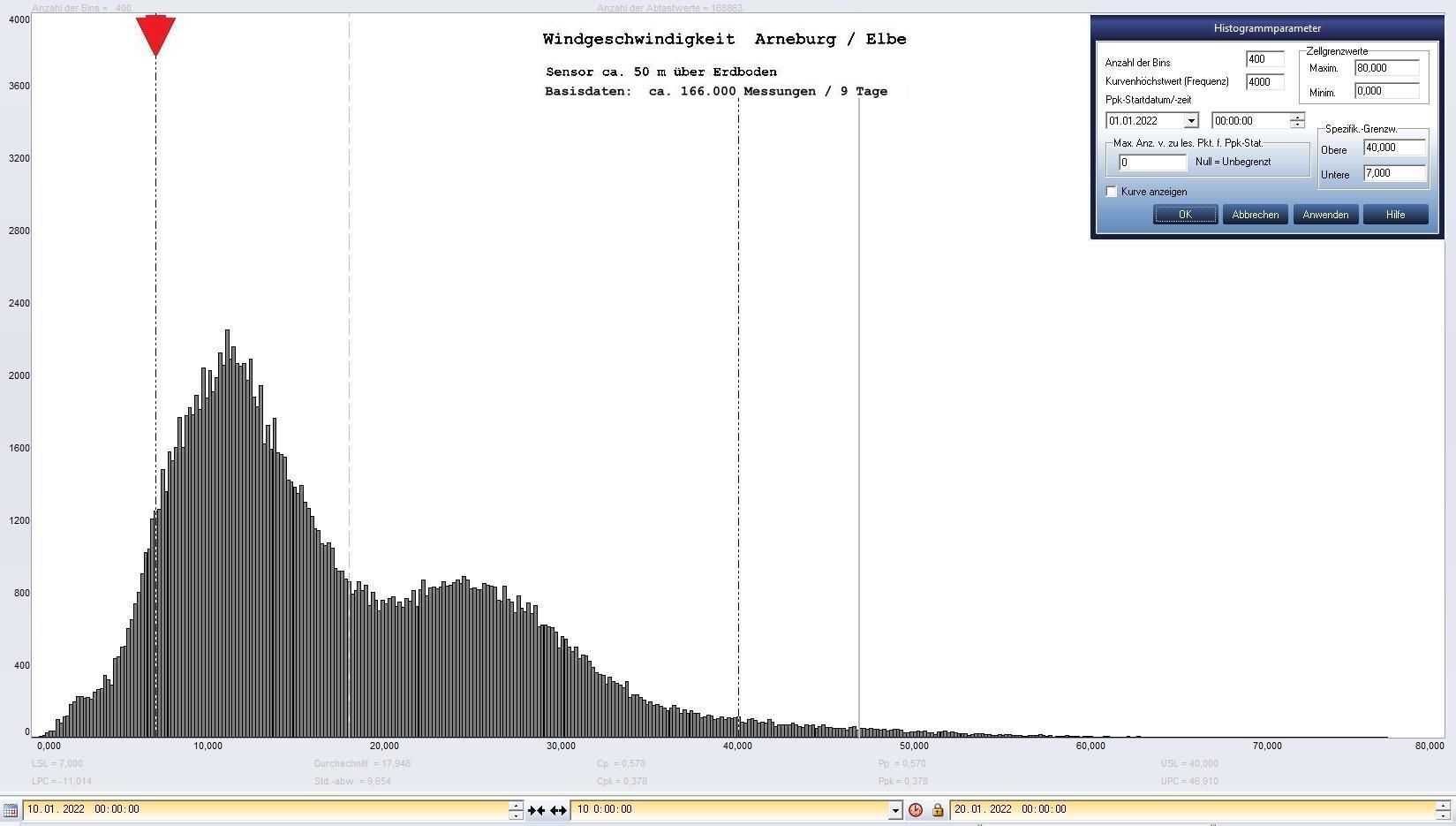Histogramme Grenzwerte (gestrichelte Linie, roter Pfeil) 7 km/h (Start Energieerzeugung) und 40 km/h