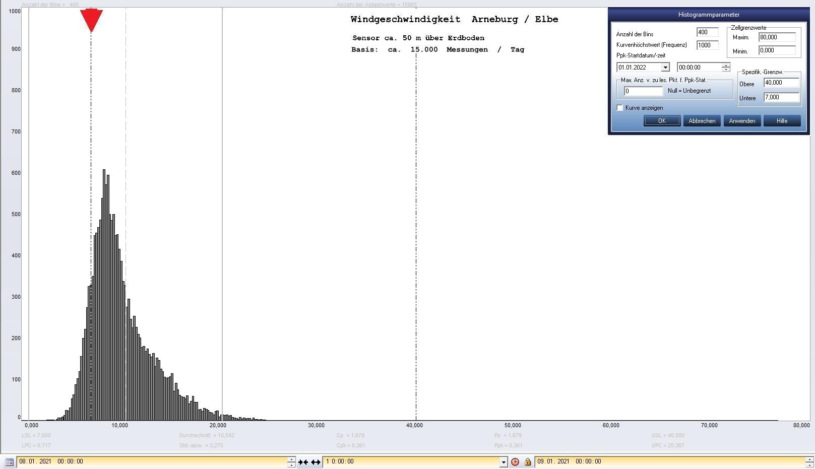 Arneburg Tages-Histogramm Winddaten, 09.01.2021