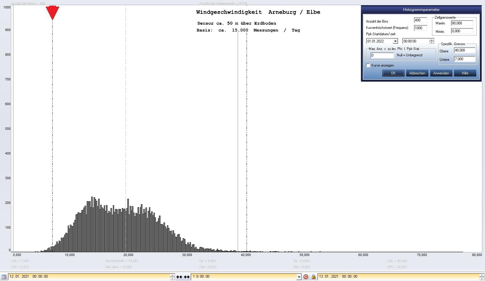 Arneburg Tages-Histogramm Winddaten, 12.01.2021