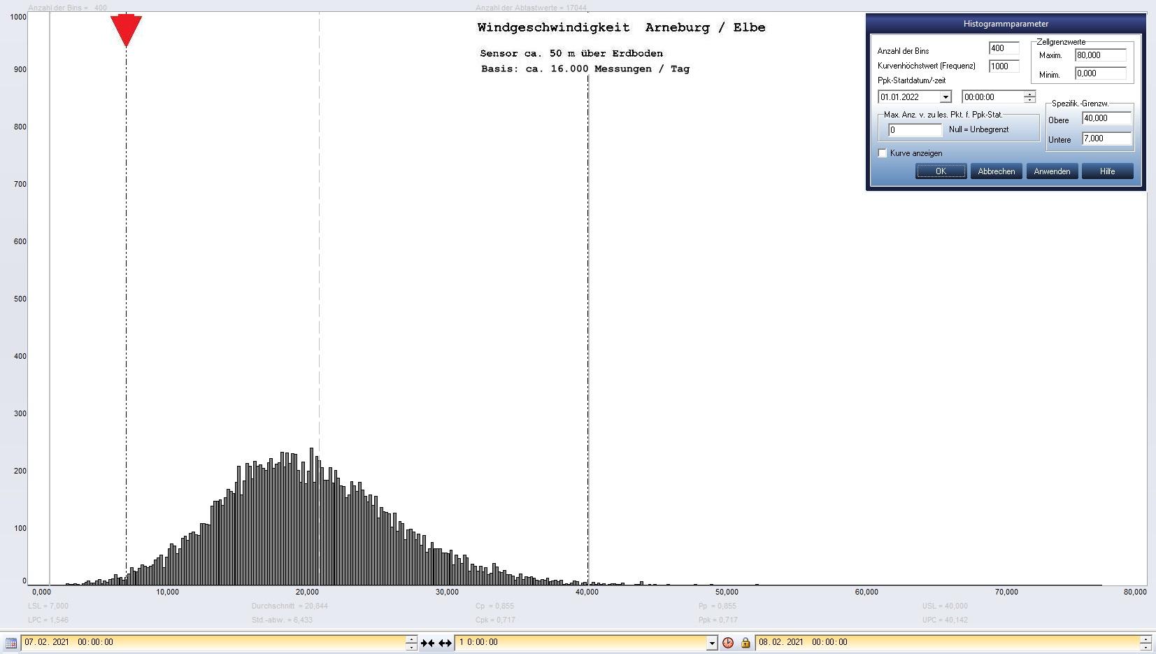 Arneburg Tages-Histogramm Winddaten, 07.02.2021