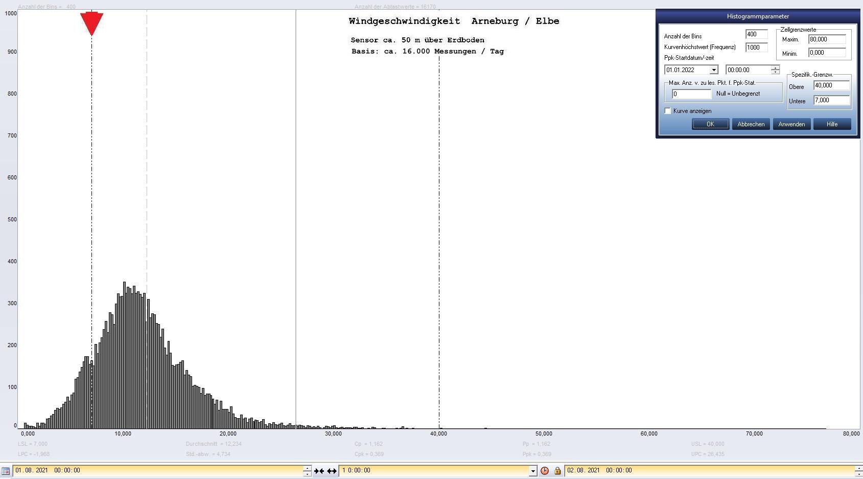 Arneburg Tages-Histogramm Winddaten, 02.08.2021
